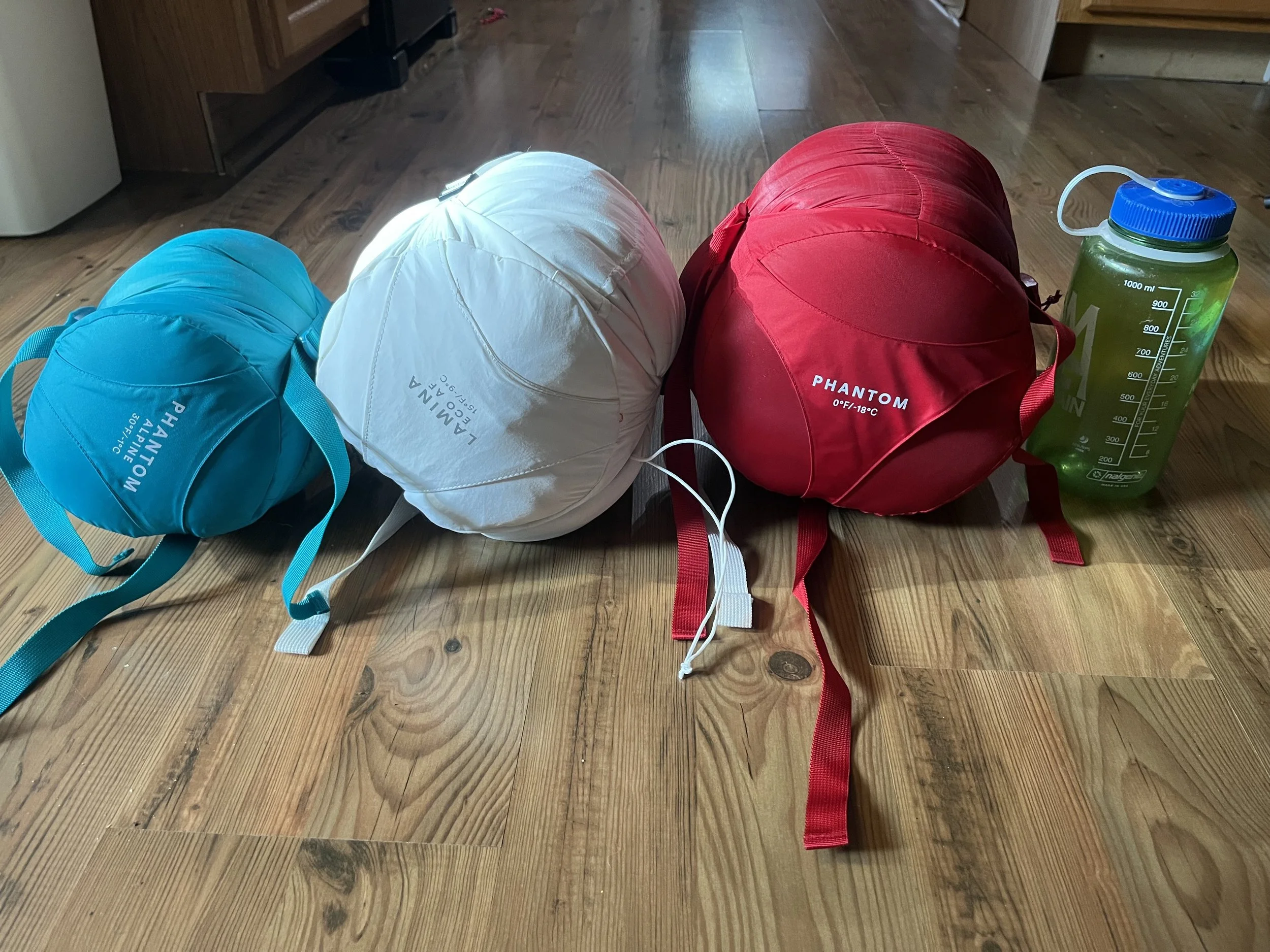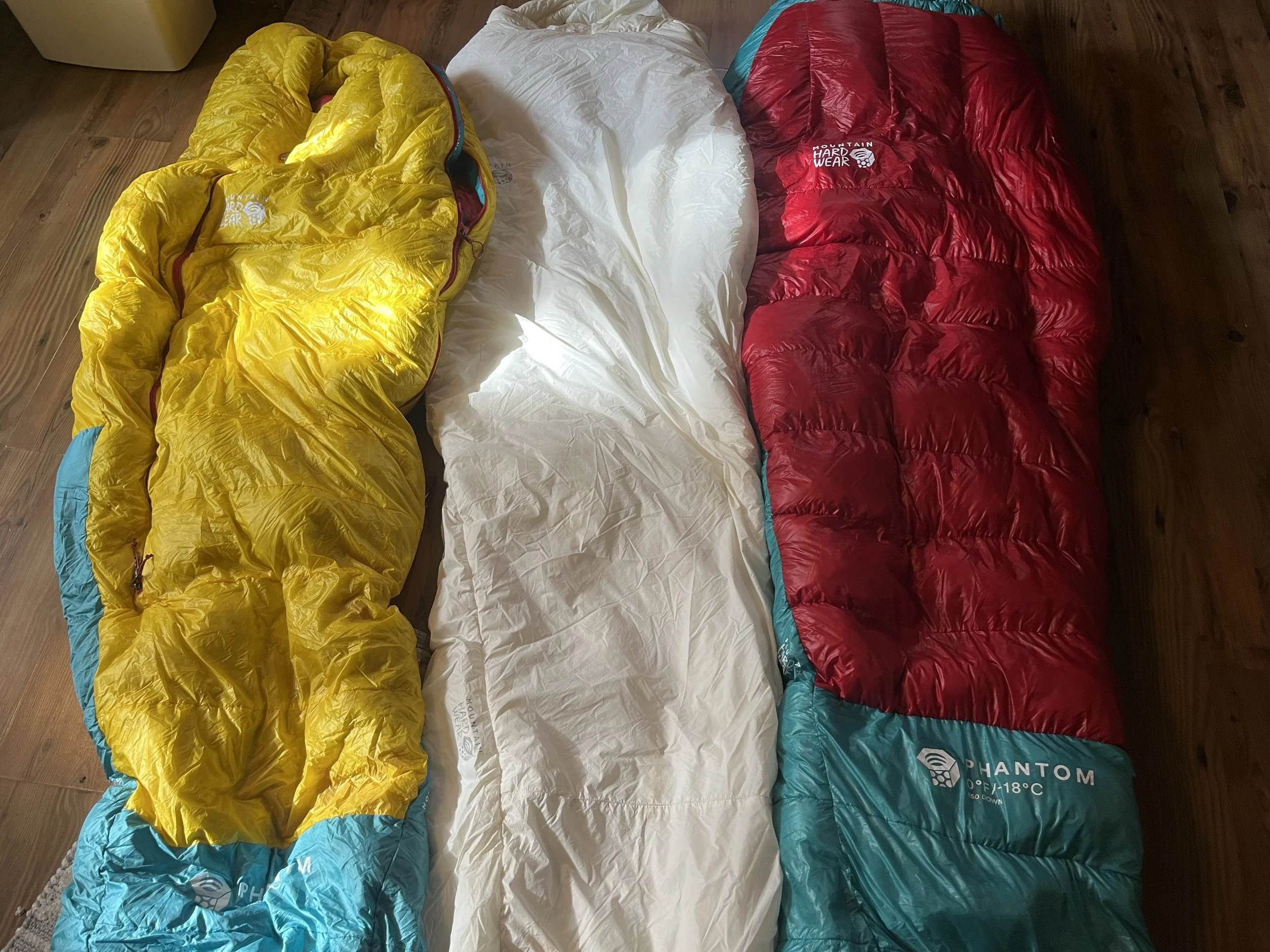 Left to right: 30-degree bag (Phantom alpine 30), 15-degree bag (lamina eco AF 15), 0-degree bag (Phantom 0)