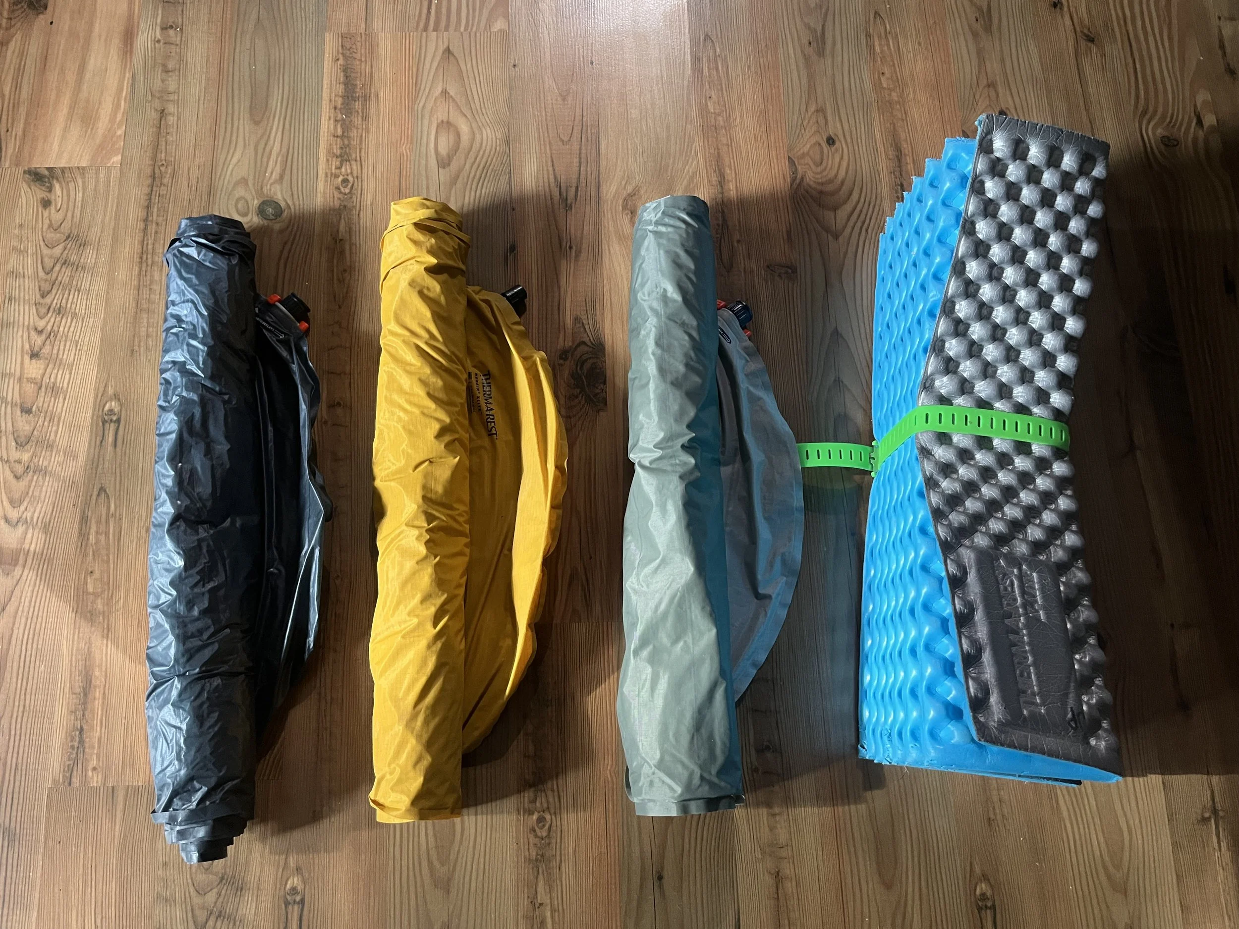 In my personal pad quiver, I usually have at least one foam pad, a really light- weight inflatable, a mid- weight inflatable, and a heavy- weight inflatable. I use the foam or the light- weight pad during the height of summer when temps don’t really drop below 40 at night. The mid- weight is for spring or fall (or summer with snow on the ground), and the heavy- weight is for winter or colder snow camping in spring or fall. Usually in the height of winter, when temps are at their coldest, I’ll also bring a foam pad to put under the heavy- weight inflatable for even more insulation!