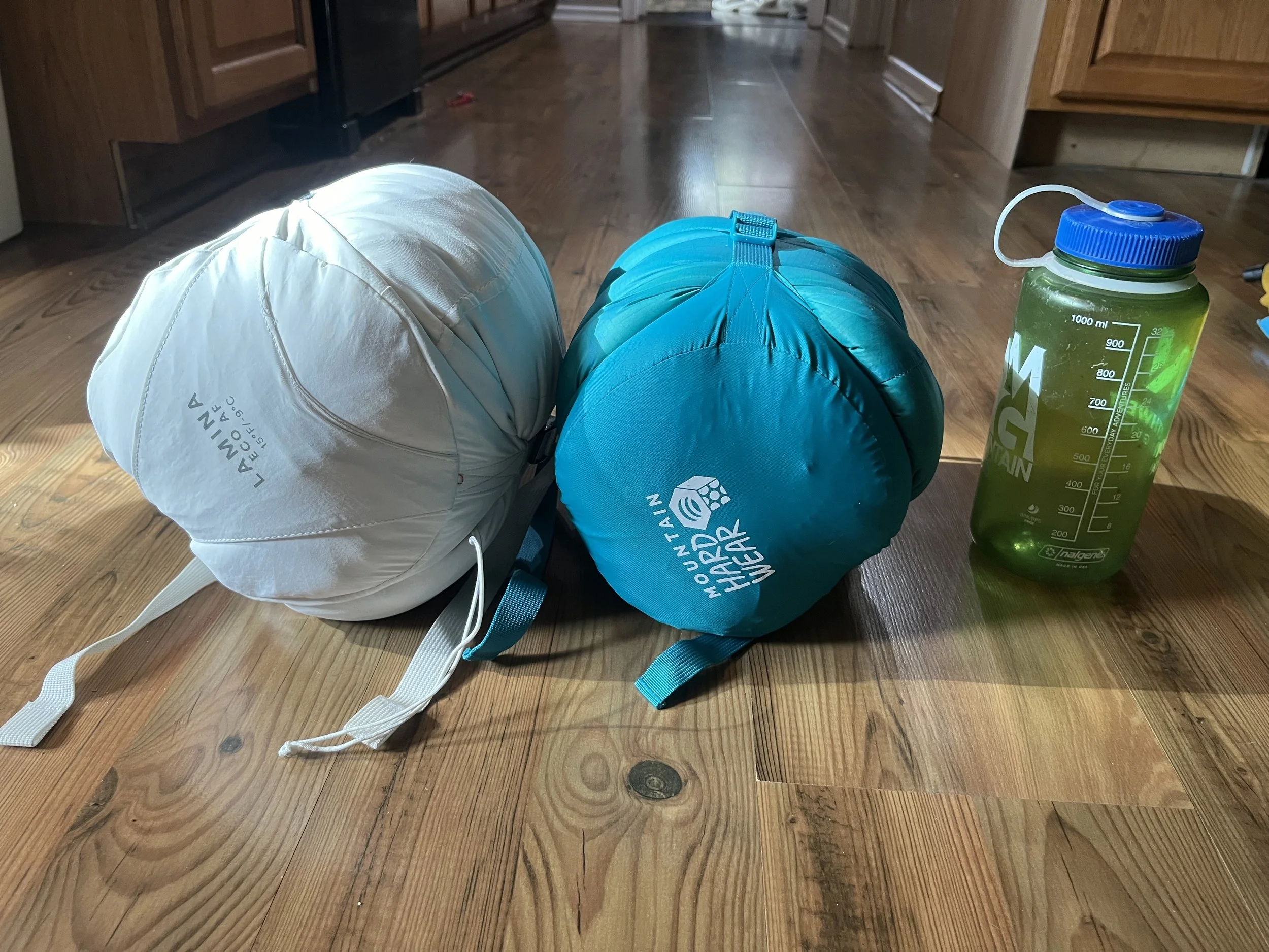 Two 15- degree sleeping bags, left is synthetic, right is down- Nalgene water bottle for scale.